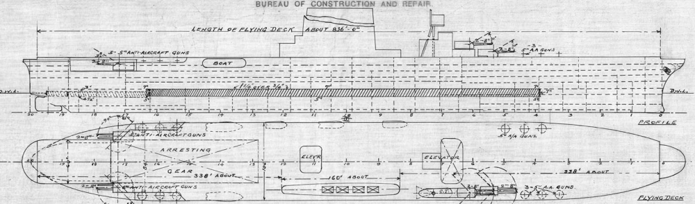 Fiscal Year 1920 and 1921 saw no approval for carriers from Congress. Though no keel laying took place before Aug 1920 on the CCs some plans were already in the making by the summer of 1921 to turn them into aircraft carriers. After a lengthy debate on the preferred aircraft carrier tpye to choose (that is many small 10.000 ton range units or a few big 30.000 ton ones would be better) the first plans for big carriers were ready by Nov 1920. The plans showed very modern features for the time, like a full island on the starboard side and catapults recessed into the flight deck. Since the size and hull shape was very close to the CCs on the building ways the General Board wanted the design adapted to their hull lines