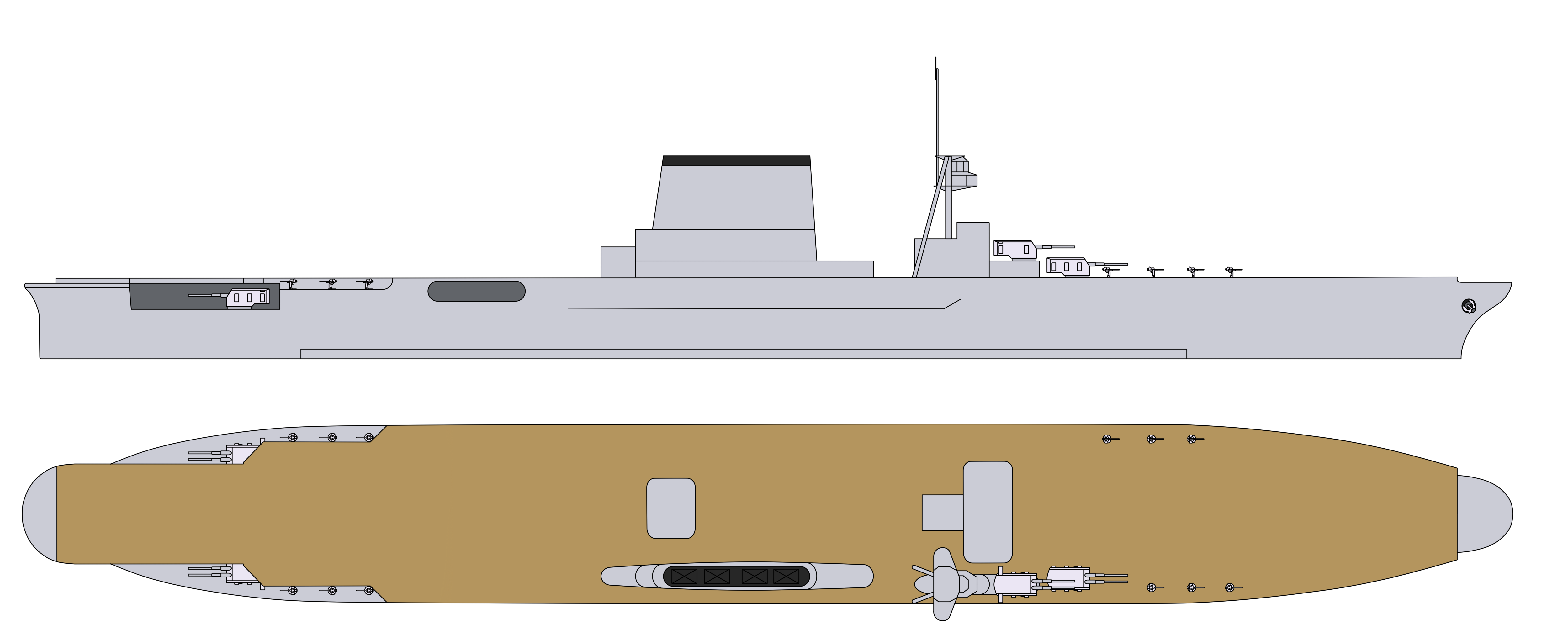 Armament was 4 twin 203mm guns in compliance with treaty regulations. These guns were thought to be necessary against the 10.000 ton heavy cruisers armed with 203mm guns, a category which was just created by the very same Washington Treaty. Secondary armament composed of 12 single 127mm/25 guns placed at four galleries (3 each) at the four corners of the flight deck. Two aircraft elevators were fitted on the centerline, next to the island and funnel. The flight deck followed the hull lines at the bow in it’s width but at the stern it retained it’s full width in it’s entire length. Due to the weight of the island, the huge funnel and the four gun turrets and due to the very fine hull lines aft both ships trimmed substantially to the starboard and aft in normal condition. To counteract this the starboard side fuel tanks were rarely filled, decreasing the range somewhat.