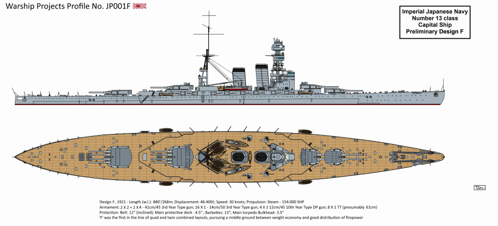 IJN, WP Profile Warship Projects Profile No. JP001F Posted by csatahajos on March 30, 2017April 3, 2017 Design F was the first mixed quad and twin design, putting the quad turrets aft with maximum separation. This was a somewhat unbalanced design with twice the firepower aft. Share this: Click to share on X (Opens in new window) X Click to share on Facebook (Opens in new window) Facebook Like Loading... Related