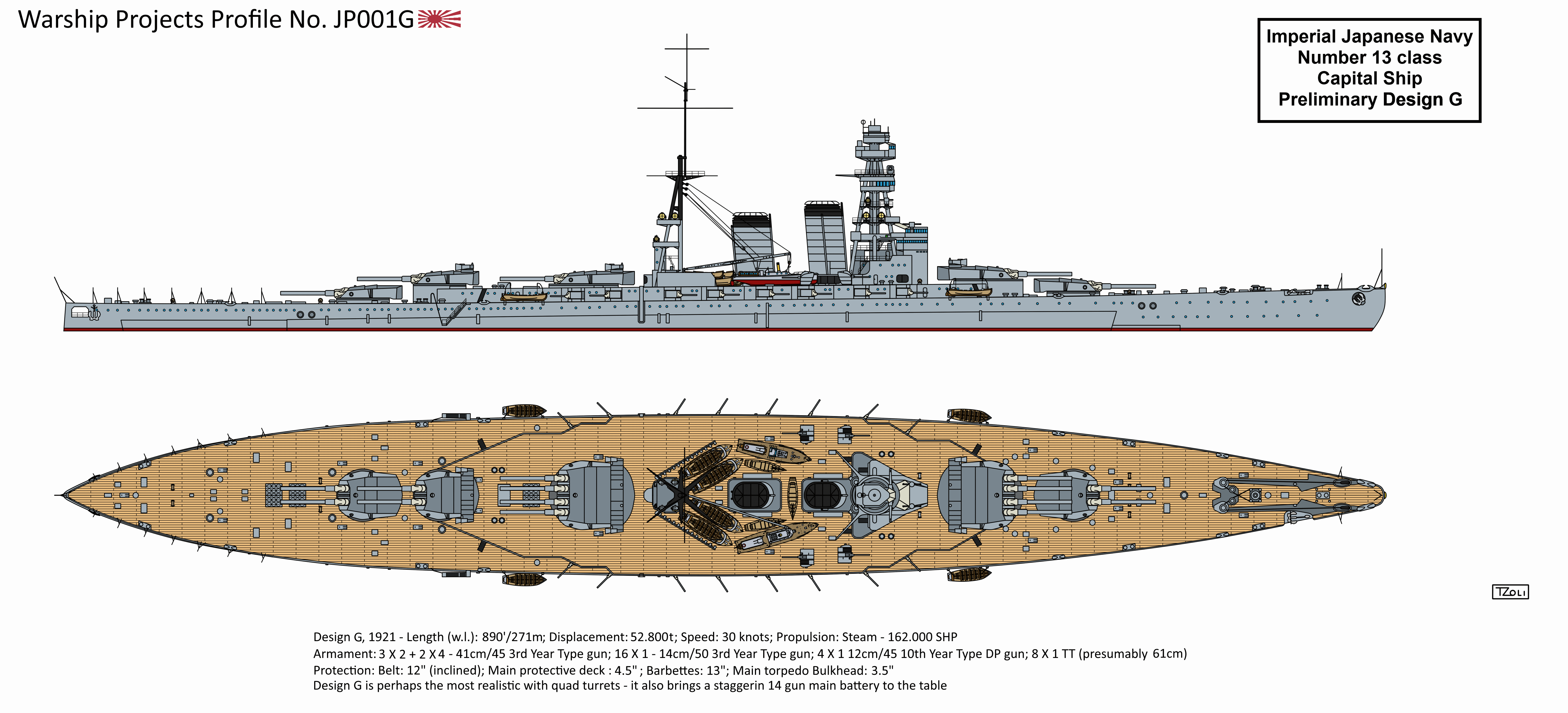 IJN, WP Profile Warship Projects Profile No. JP001G Posted by csatahajos on March 30, 2017April 3, 2017 14 guns that is ‘G’ – quad turrets moved into the best positions form a torpedo defense and stability point of view; this was probably the most balanced of the lot Share this: Click to share on X (Opens in new window) X Click to share on Facebook (Opens in new window) Facebook Like Loading... Related