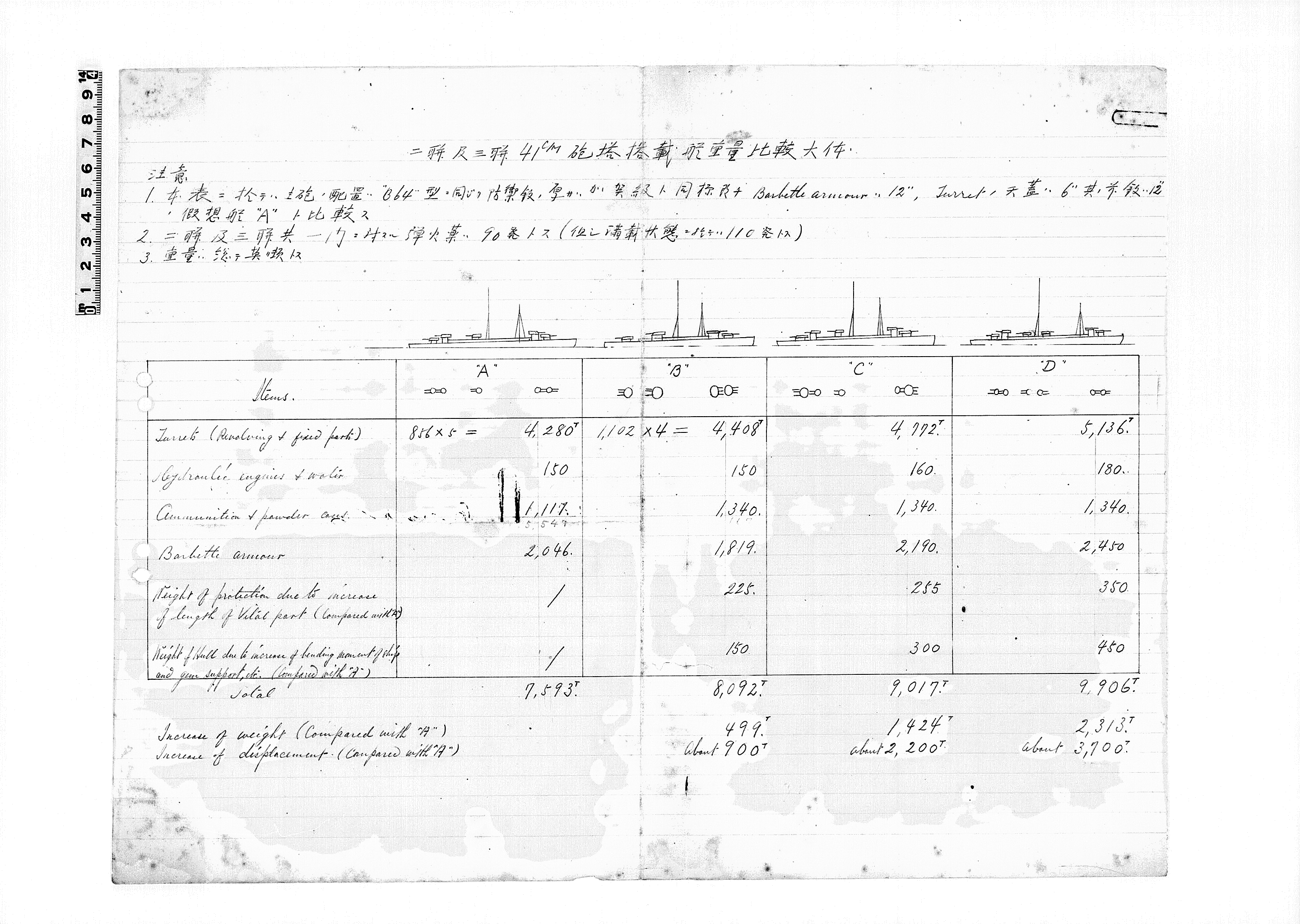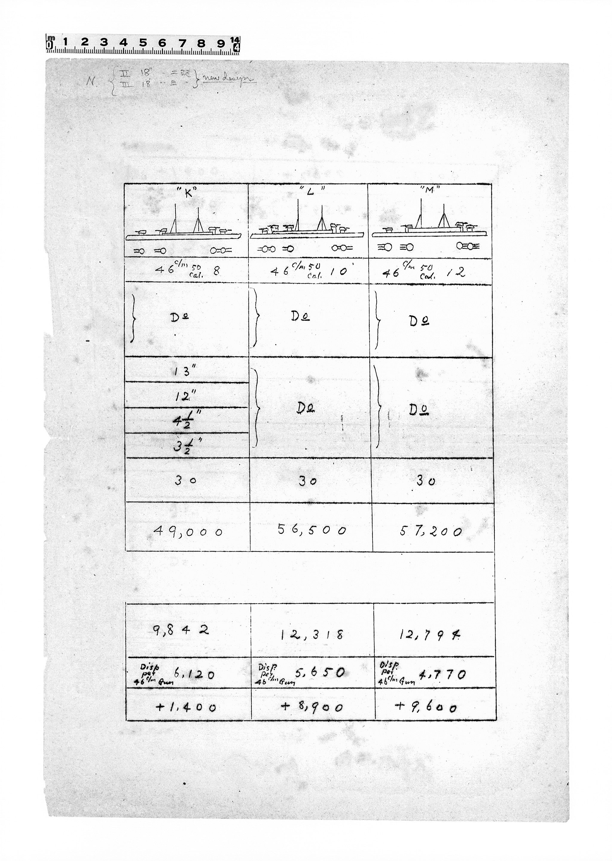 This design is not 100% official as it only appears as a pencilled-in sidenote on the revised designs table and the rest is artistic license based on the other designs in the series. Worthy to note that this ship had 13 – 18″ guns and with it it is the most powerful of the series. For convenience I’ve included both parts of the revised designs table that show the modifications done to previous designs as well (note especially ‘D’ with different arrangement of turrets and superstructure). COmpare this with the table in ‘M’s WPP.