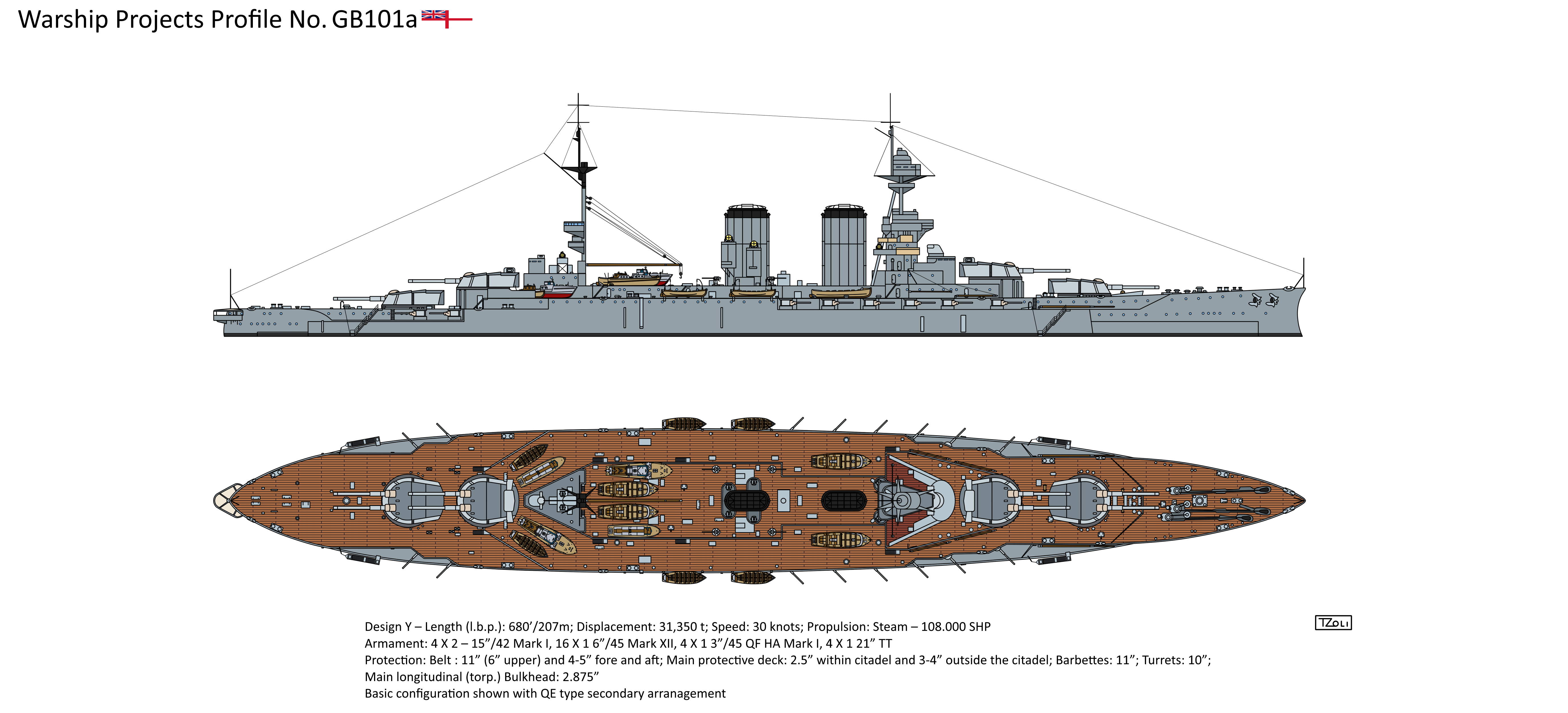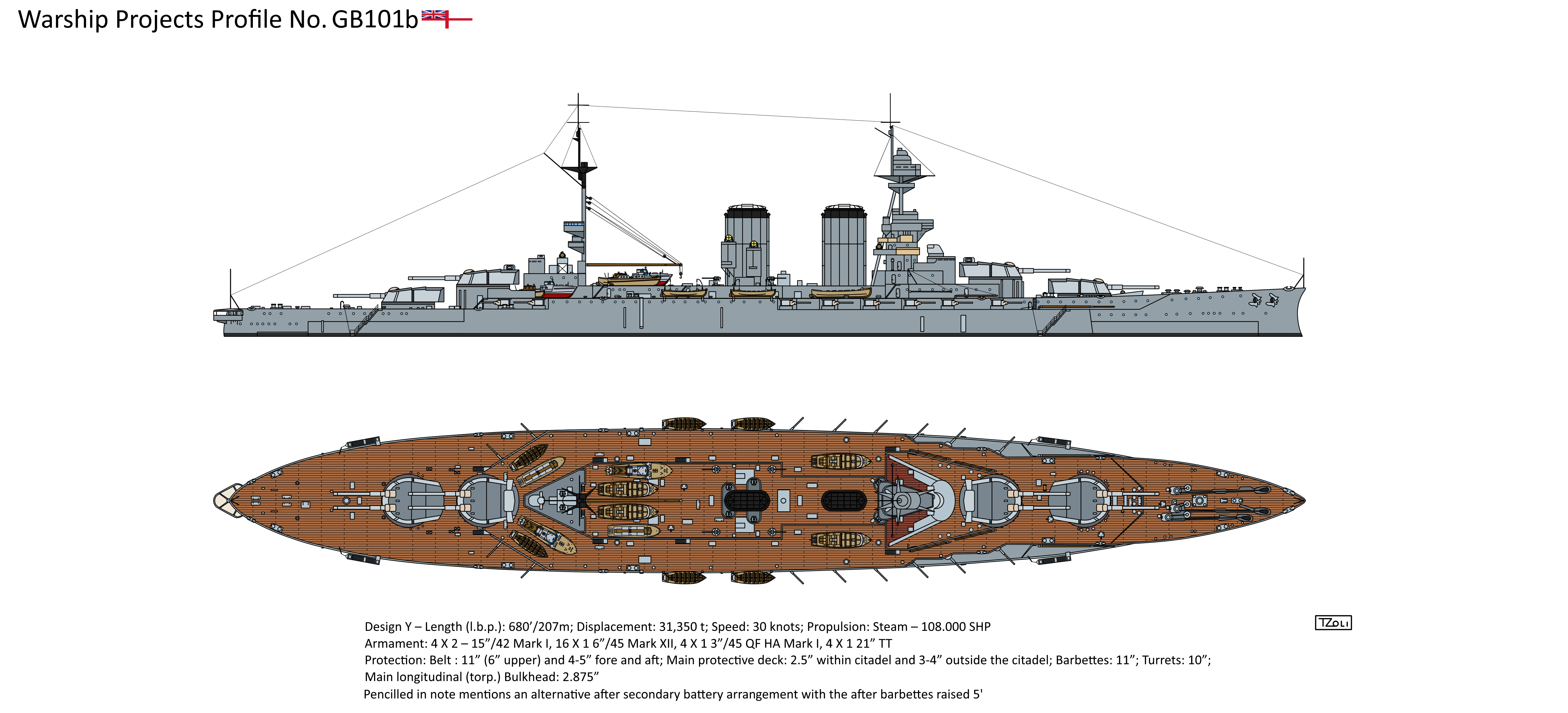 This particular sketch appears in Sir Eustace Tennyson d’Eyncourt’s workbook under the designation ‘Design Y’, supposedly from 1914, predating the decision by Fisher to convert REPULSE/RENOWN into battlecruisers. It is speculated that intelligence about the then brand new German SEYDLITZ’s armor protection sparked this concept. It is basically a massively enlarged TIGER with 15″ armament in classic layout and with armor brought up to about halfway between battleship and battlecruiser levels (11″ belt vs TIGER’s 9″ and R class’ 13″). The resulting ships would have been built as the battlecruiser companion to R class battleships. It was rejected though with the comment that underwater protection is lacking. On the other hand it is obvious here that cooler heads in the Board of Admiraltry envisioned greatly improved armor protection for future battlecruisers as well.