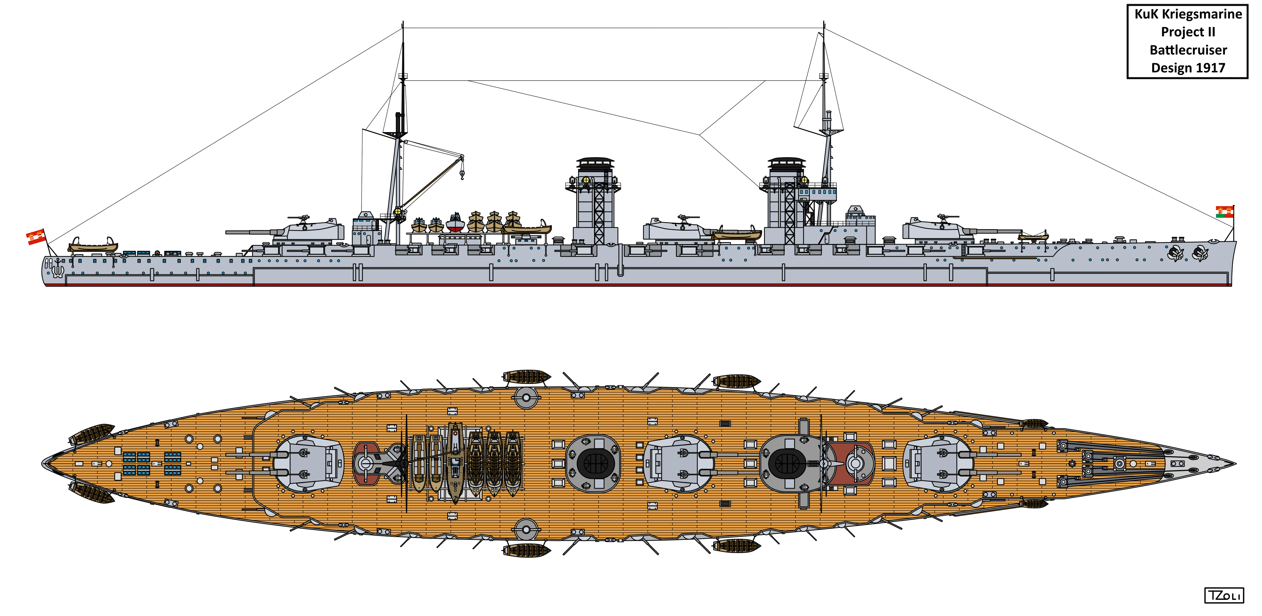 The KuK Kriegsmarine produced a number of capital ship designs starting from around the time of the Battle of Jutland to late 1917, early 1918 featuring mostly battlecruiser designs but a few battleships as well. Not much is known about the history of these designs apart from that they are prepared for the post war fleet, showing that the Austro-Hungarian Empire wished to end the war soon.