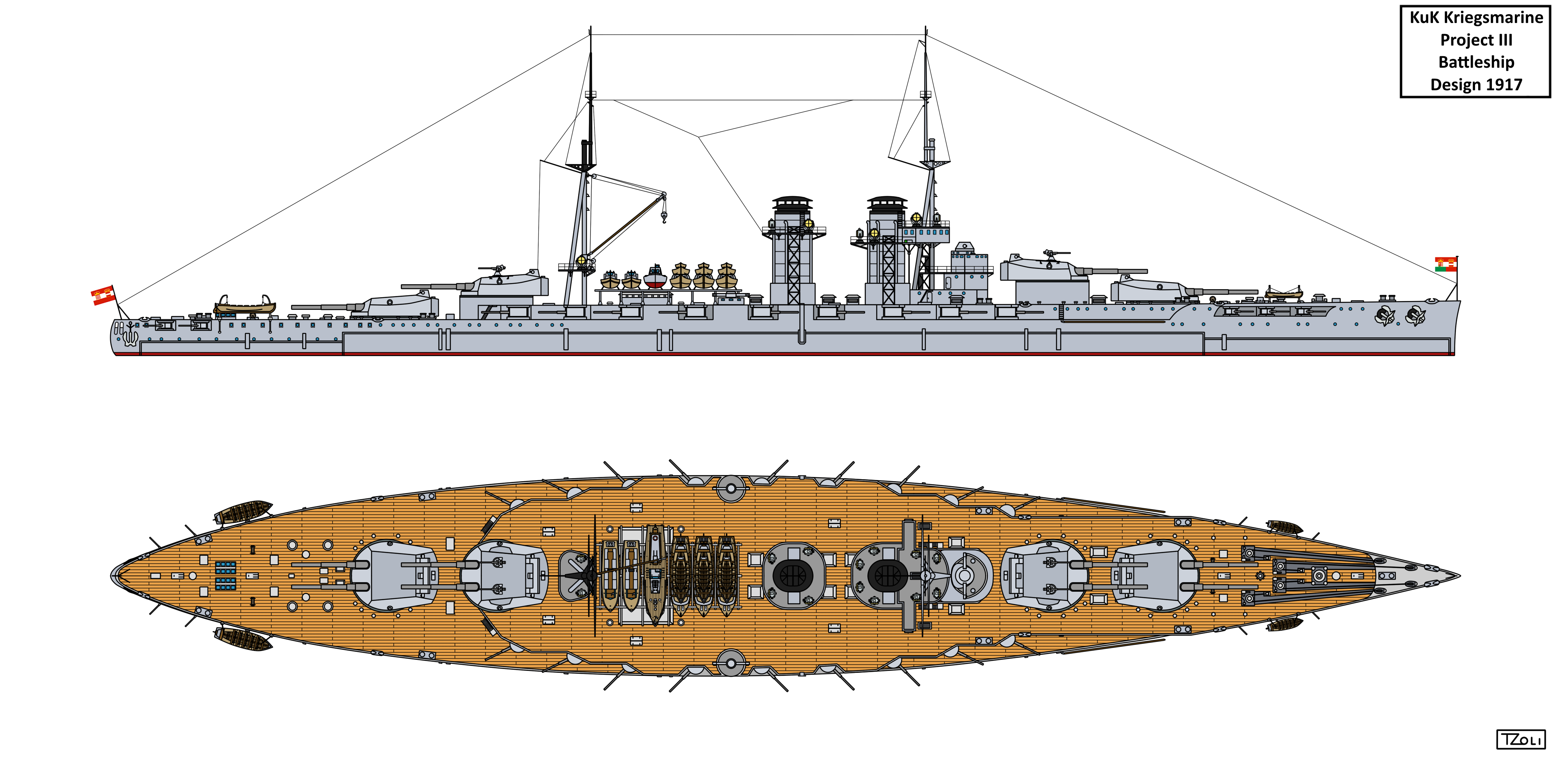 On April 16, STT was interested in receiving plans. Although the plans included mainly 30,5cm L/50 caliber cannons, the 30,5cm L/45 caliber ones were included as well. Skoda, who produced the cannons, had problems with the development of the longer caliber version, so the shipyard of Trieste redesigned the plans for projects VI and VII with L/45 caliber main guns. On April 20, MTK asked STT to produce another 12 gun version with a 6 turrets arrangement which was completed on the 27th in 2 variants. Shortly thereafter, on May 5th, at Montecuccoli’s personal request, STT Trieste prepared another 12 gun L/45 caliber main gun armed design with 4 triple turrets which became Projekt VIII and which was used as a basis for the final version.