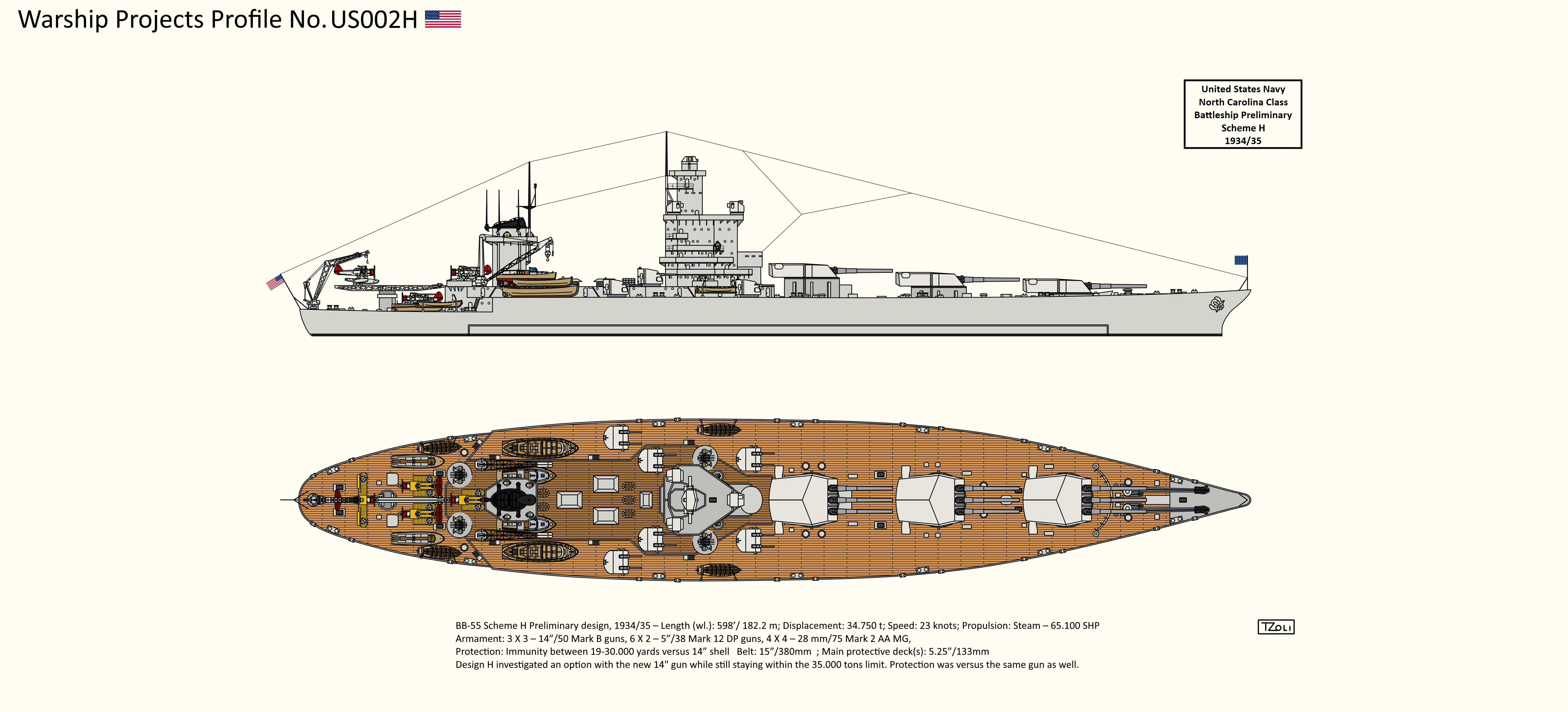 As part of the run up to the new battleship class to be build after the “Battleship Holiday” Design H evaluated an option with the new 14″/50 gun then under design and protection was designed against them as well. The design complied with the 35.000 ton limit and also employed an interesting main battery layout to reduce top weight and separate turrets as much as possible while retaining an all forward layout. Speed was reduced to 23 knots only in order to maintain protection.