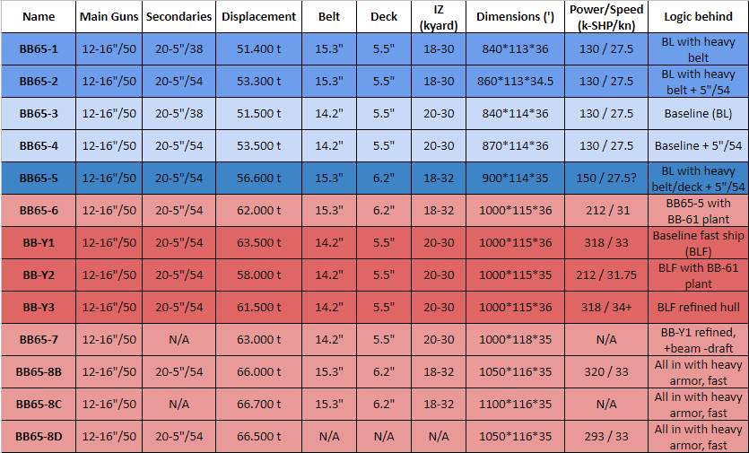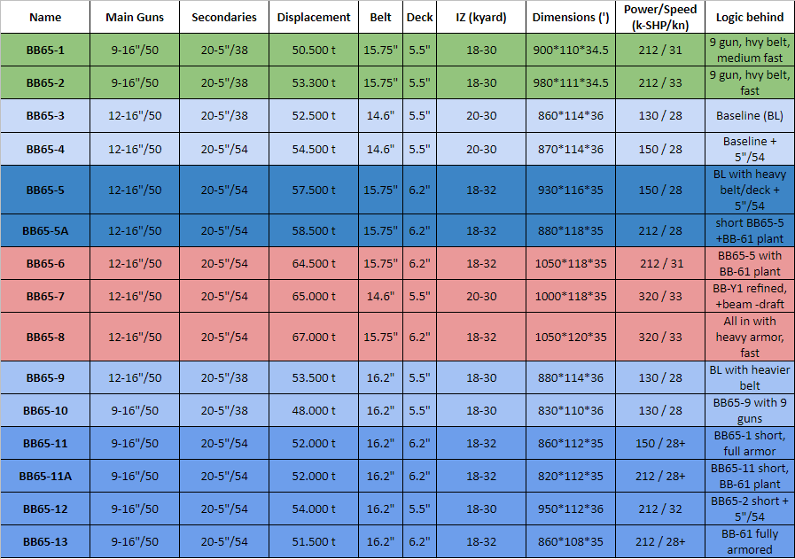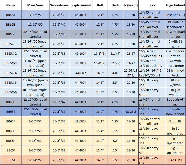 BB65A to J. Color coding represents grouping by design logic. Data for C2 and C3 are confusing in several sources, therefore the actual armor thicknesses are extrapolated from the other designs