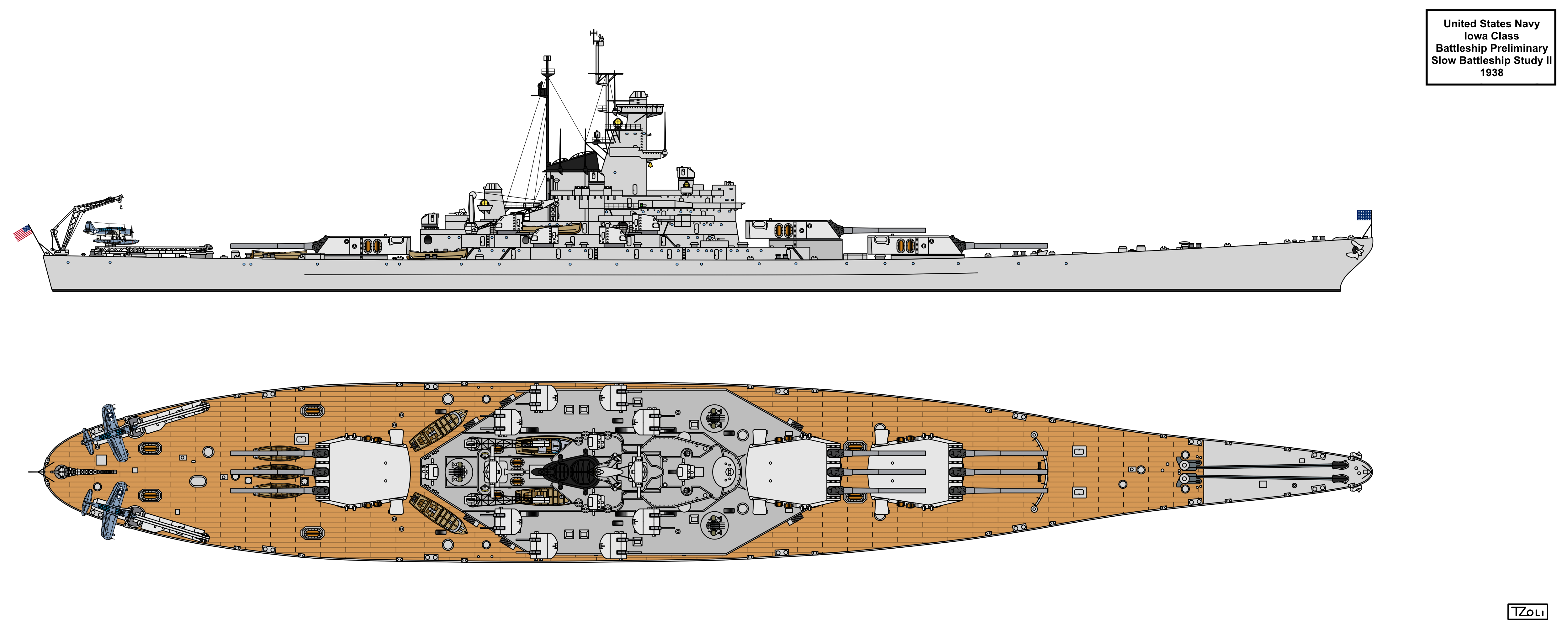 The slow version of the 45.000 t battleship started out it’s cycle in very late ’37/Jan 1938 to investigate how the possible escalator clause on tonnage could be best used. Essentially the designers added a 4th triple 16″/45 Mark 6 turret to the BB-57 design: length grew to 770′ on the waterline. Armor was changed a bit (thinner belt but heaver decks, turrets and splinter protection) so the IZ was 20-30kyards against the Mark 6 gun with the normal shell. Propulsion was increased to 170.000 SHP to maintain 27 knots. The design reflected the original BB-57 in retaining only 16 of the secondary 5″/38 guns.