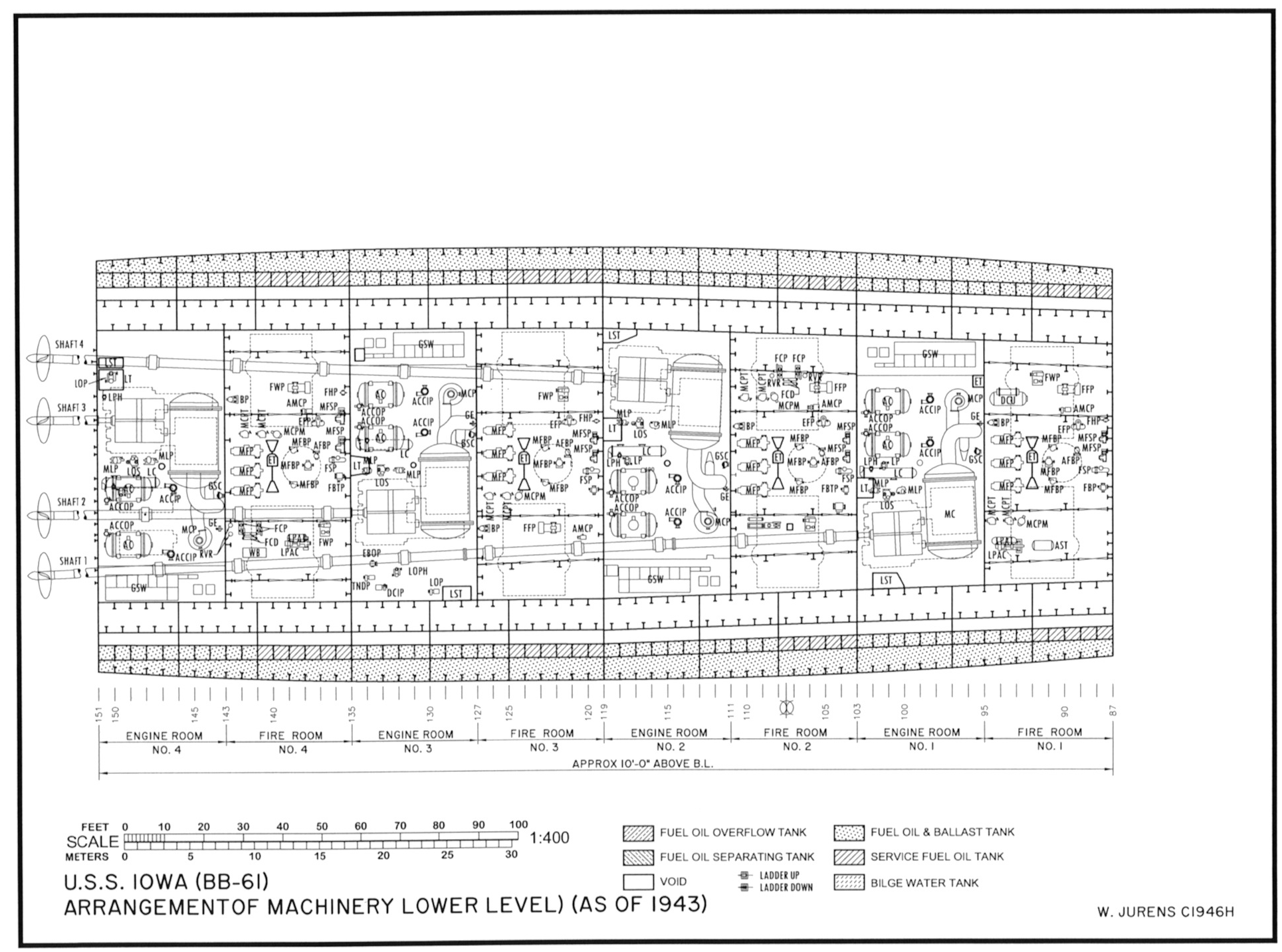As detail design progressed from late 1938 some more changes were made to make the BB-61 type more survivable. By Nov 1939 the 4 huge machinery spaces (that duplicated the BB-57 layout but with much larger room sizes to accommodate the bigger boilers) got further divided into 8 rooms. Auxiliary machinery with a pair of boilers placed side-by-side moved into a separate block and turbines into the other half of a former unit machinery space, thus reducing flooding by half in case of a hit directly on a bulkhead. This was suggested by the New York NY, building the lead unit and doing the detail design.