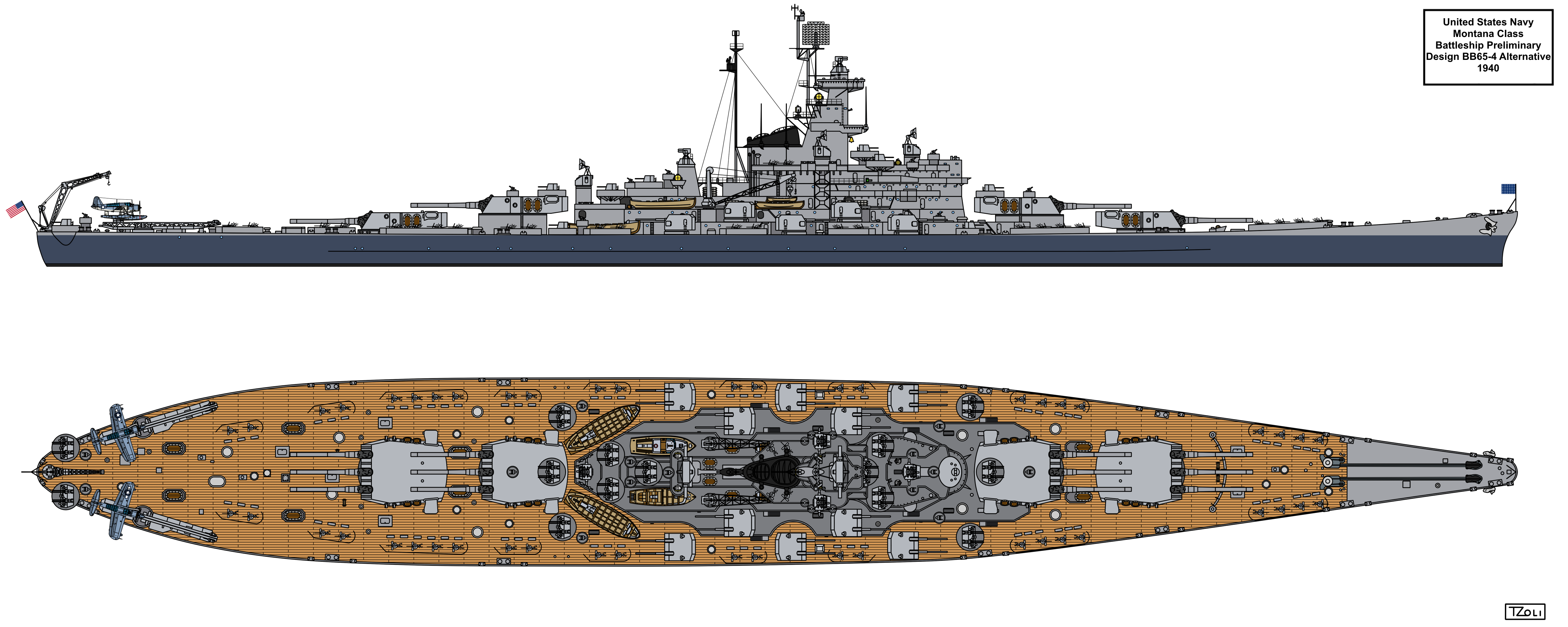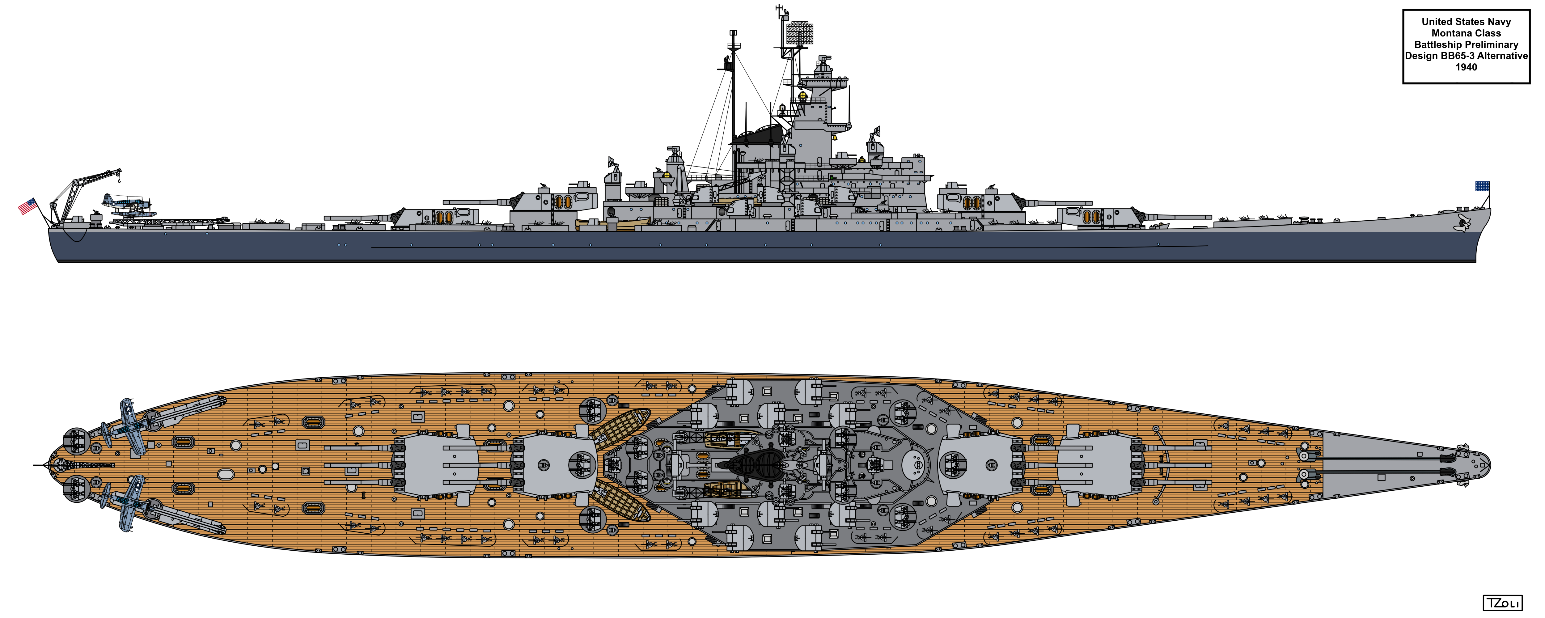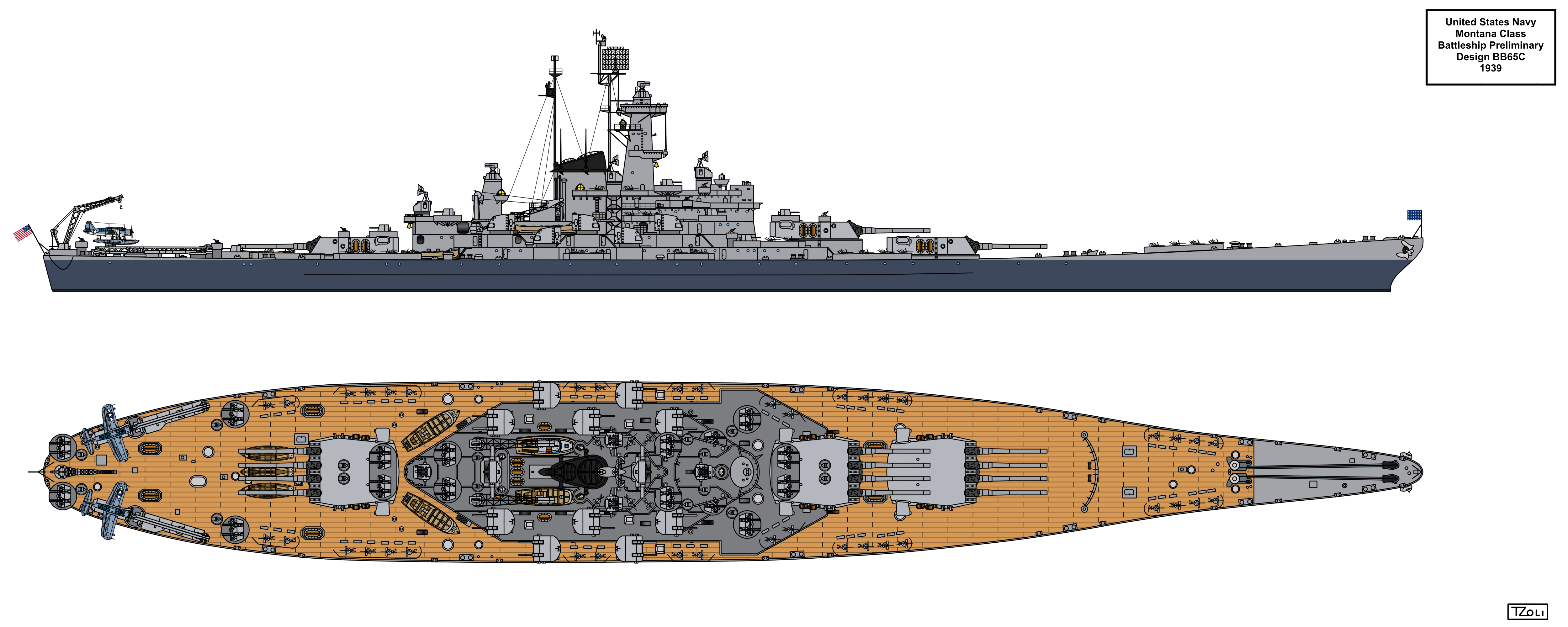 The Montanas were the last and final battleship class designed for the United States Navy with design process starting in parallel to the BB-61 Iowa class. The fast 45.000 tonner, described above, took priority as it was preferred by many in the navy. Also trustworthy information on foreign ships were scarce and it was thought that the BB-61 class ships would be equal if not better to anything under construction. Still in the background work went on to create a new “standard” type of battleship which was not so fast but had the best possible armor protection with maximum firepower. As the design progression took well beyond 1939 it had two distinct phases, the BB-65 series and the BB-67 one. The first one was still limited to 45.000 tons and was intended to be built following the first four Iowas, hence the hull number. With treaty limitations going away however a fresh set of plans investigated all possibilities, including extreme dimensions, but these still ran under the BB-65 moniker.