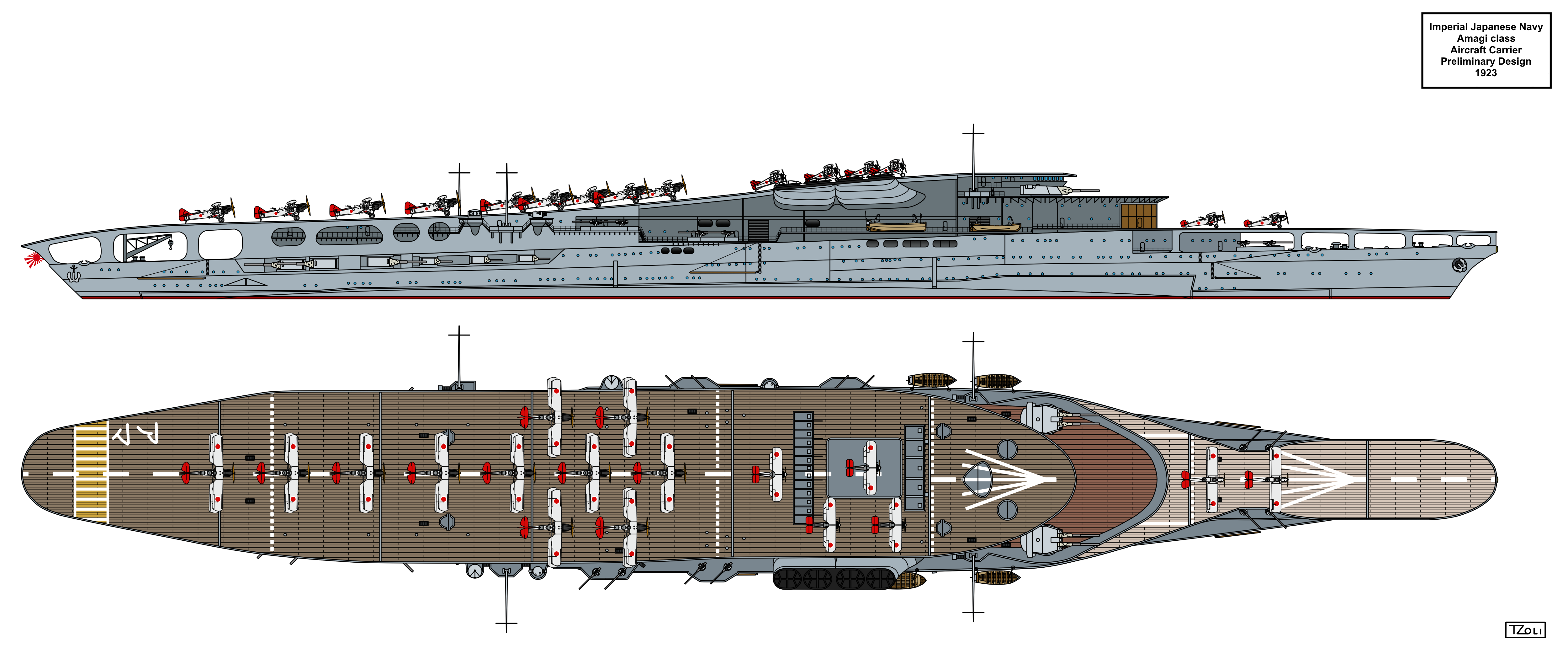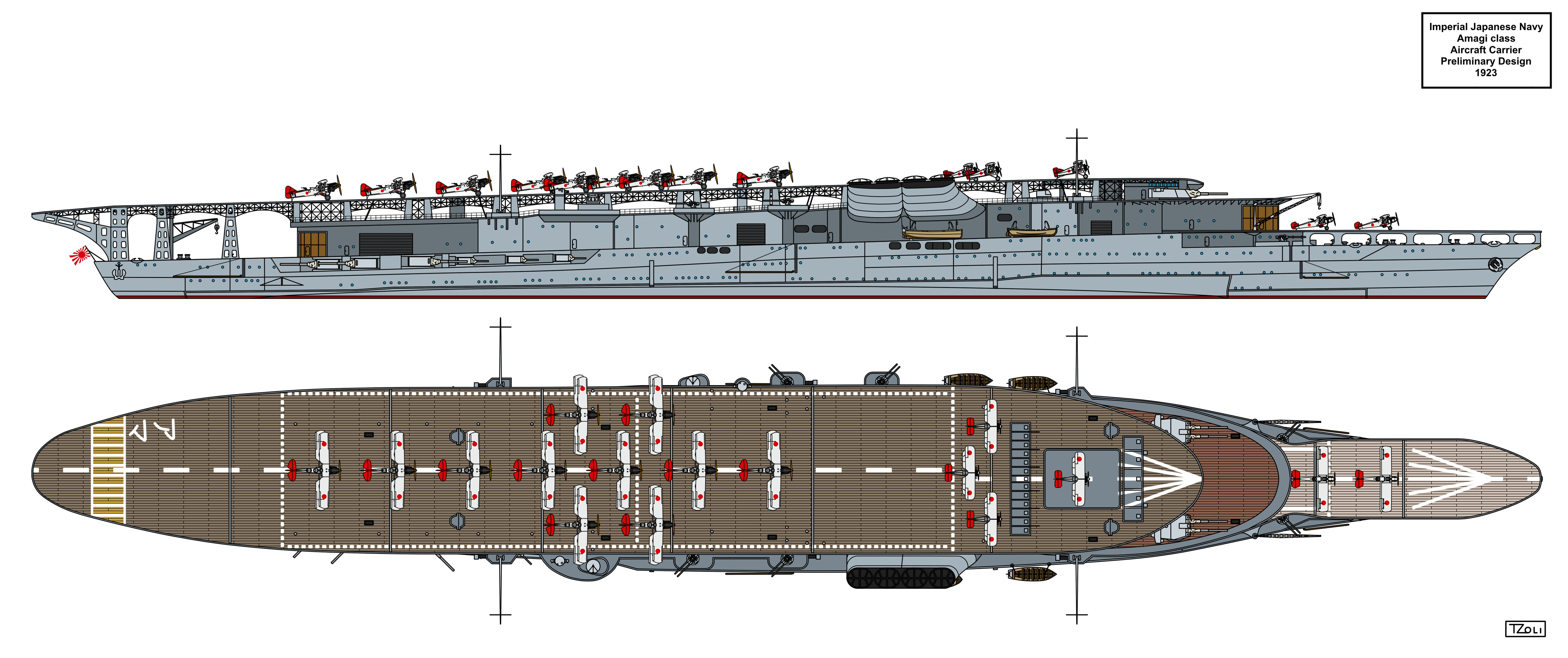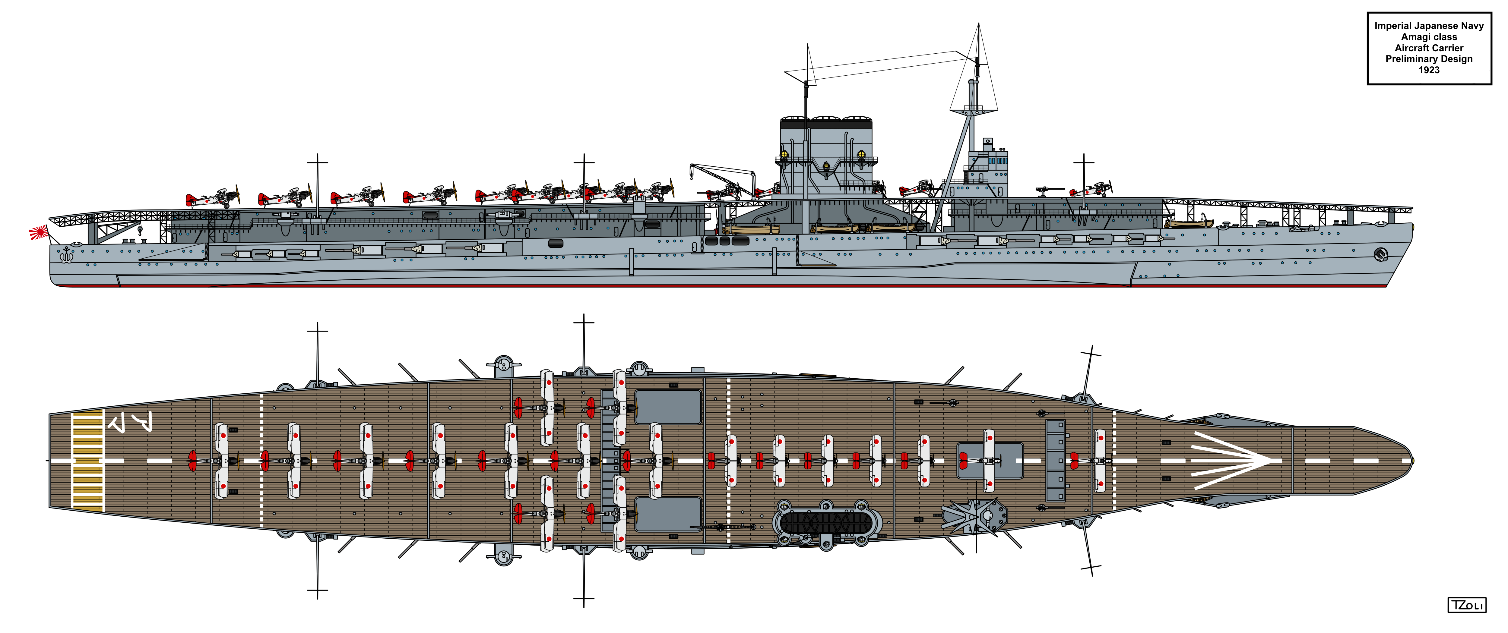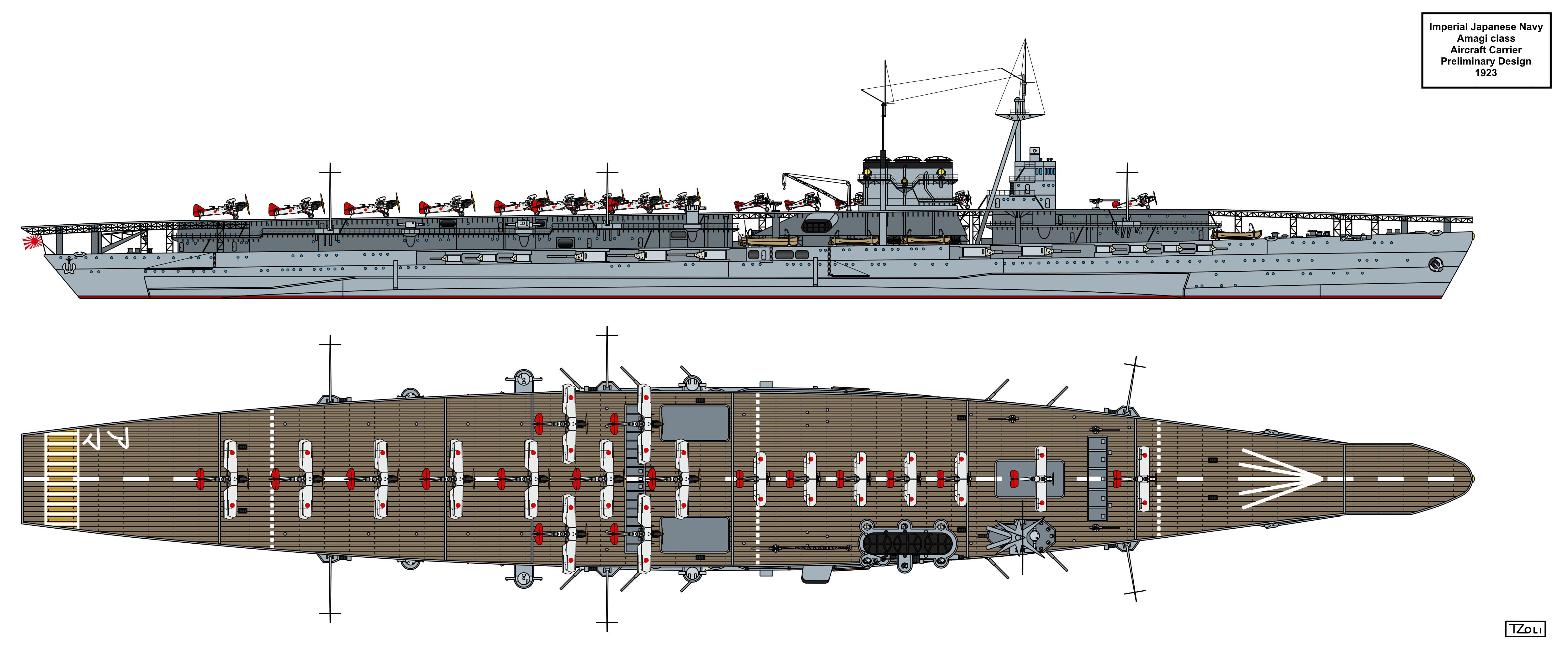 Just as with the US Navy before the Lexingtons, the Japanese were looking at carrier designs utilizing the most suitable hull design, that is of it’s new 16″ battlecruisers hulls. So it was no wonder that when these said hulls became superfluous some carrier conversions were drawn up, resulting in what became the Akagi.