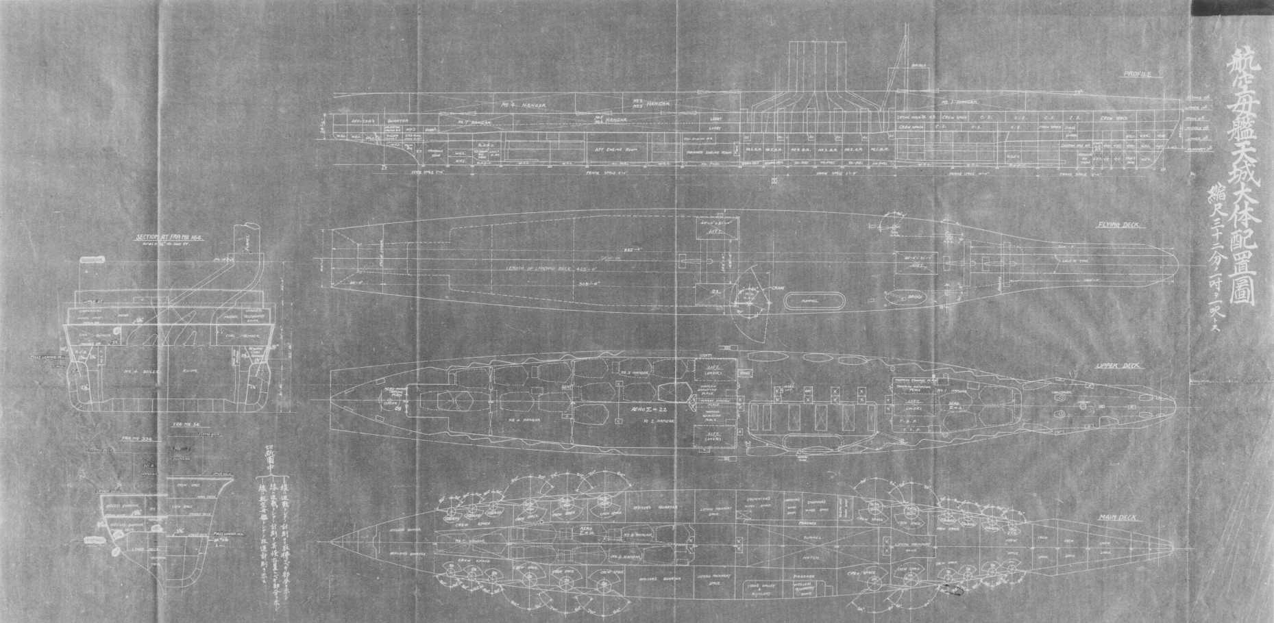 First of the preliminary proposals to convert the Amagi class Battlecruisers IJN Amagi and Akagi to aircraft carriers this early implementation showed a hangar capacity of only 36 torpedo bomber sized aircraft (Mitsubishi B1M). There is a large unoccupied space around the funnel uptake with 7 small hangars distributed among 3 larger spaces in the hull: one forward for 4 aircraft (No.1), one aft for 22 aircraft (No.2-4) and one below the after one (No.5-7) for 10 aircraft.