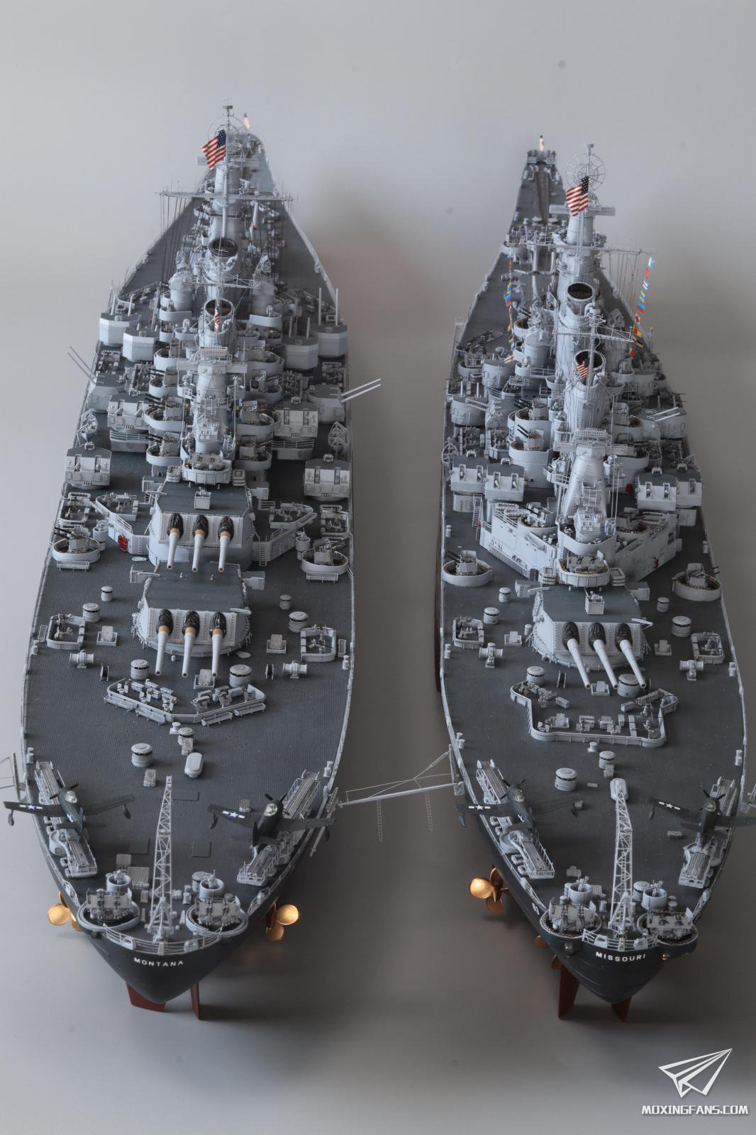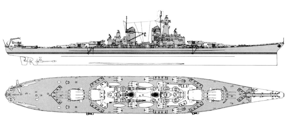 Probably the most often used statement and question. And the answer is definitely NO. While the main battery guns and their turrets are indeed the same and it has one more turret, the two type shares relatively little else other than that. The Iowa is a fast type where everything was tailored to achieve 33 knots maximum speed whereas the Montanas were conceptualized to maximize firepower and protection over speed (28knots). In fact the Montanas share more design features with the North Carolina class than with the Iowas. One very important difference often overlooked is the beam (108′ vs 121′) which might not be apparent from side views where the two classes profile might appear similar. Iowa was still limited by the 110′ locks of the then existing Panama Canal, therefore the ship’s volume was increased in the vertical dimension. It is very evident in bow on views of the ship or in top down views by the area covered by the 01 deck level, it basically extends out to the side of the hull. The Montana had no such restrictions and it’s volume increases in the beam direction, much lowering the bulkiness and volume of deckhouses above the main deck.
