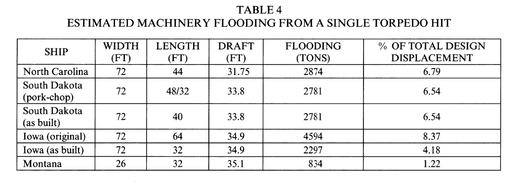 Calculations showed a four fold improvement compared to BB-61 in torpedo resistence from a single hit, based on calculated flooding: