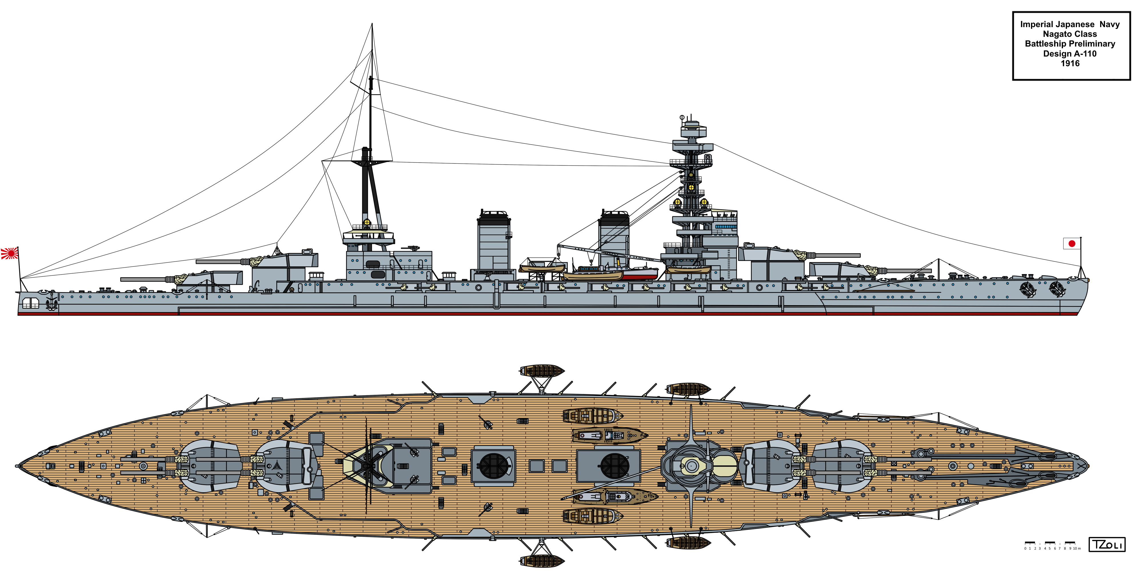As mentioned earlier the design history of the Nagato class is quite difficult to research, mostly because of missing material and the language barrier. While the language barrier could be overcome by translators and naval enthusiasts willing to translate Japanese texts, missing material is a major obstacle. It is known that the design number of the battleship class preceding the Nagatos, the Ise class was A-92, while Nagato’s design number was A-114, which means we have a missing set of 21 battleship designs not accepted for construction. Research in the Hiraga archive resulted in two design which had such numbers: A-110 and A-112 both of which had drawings.