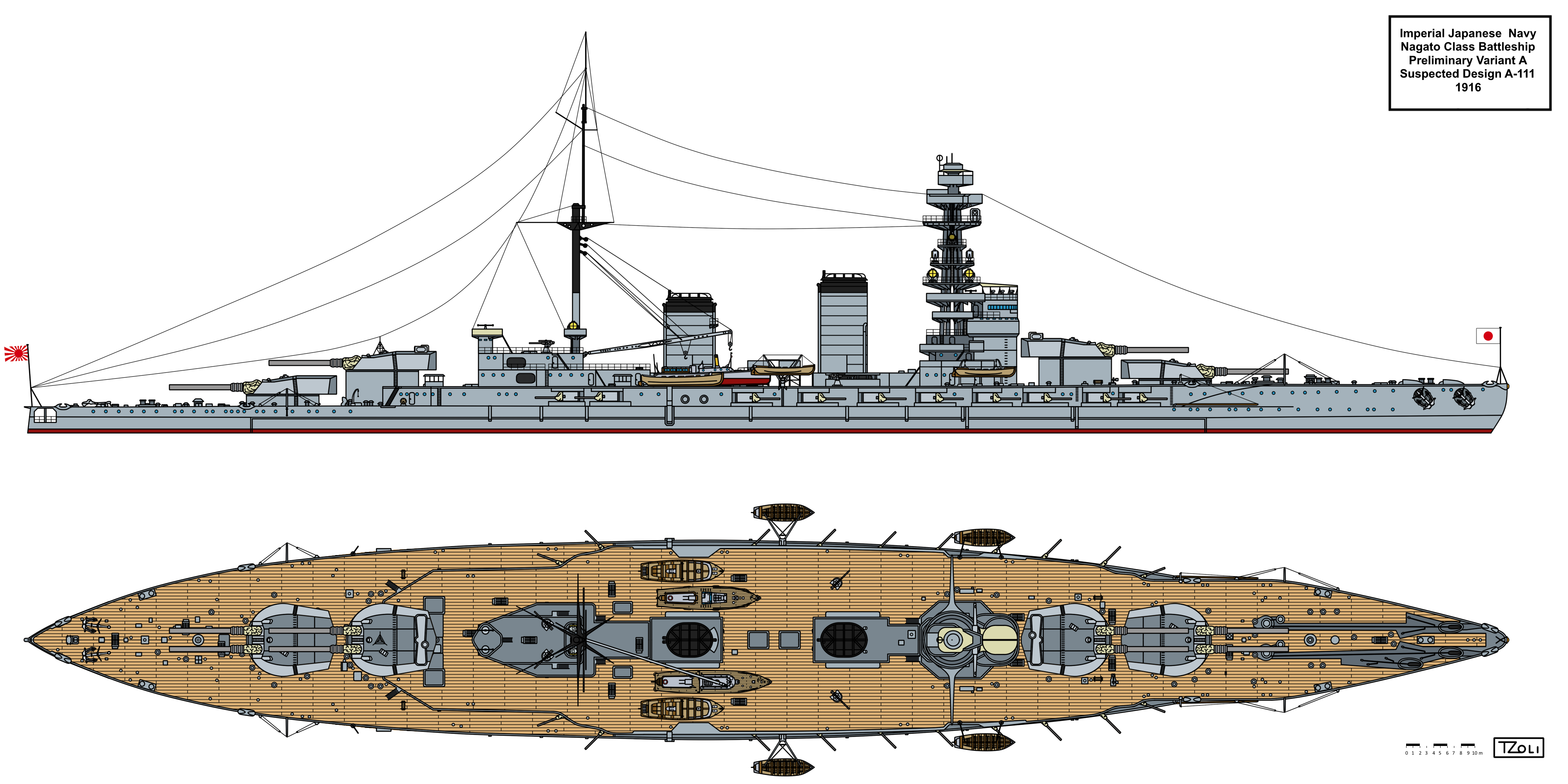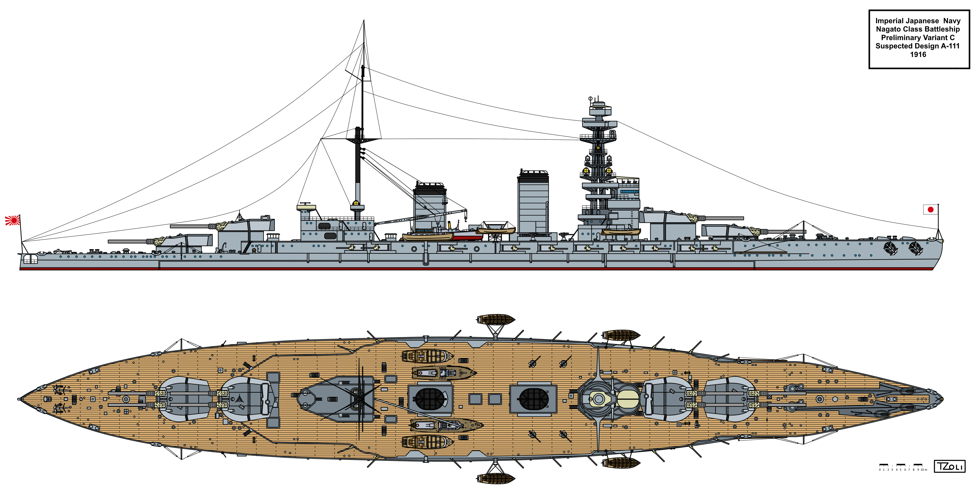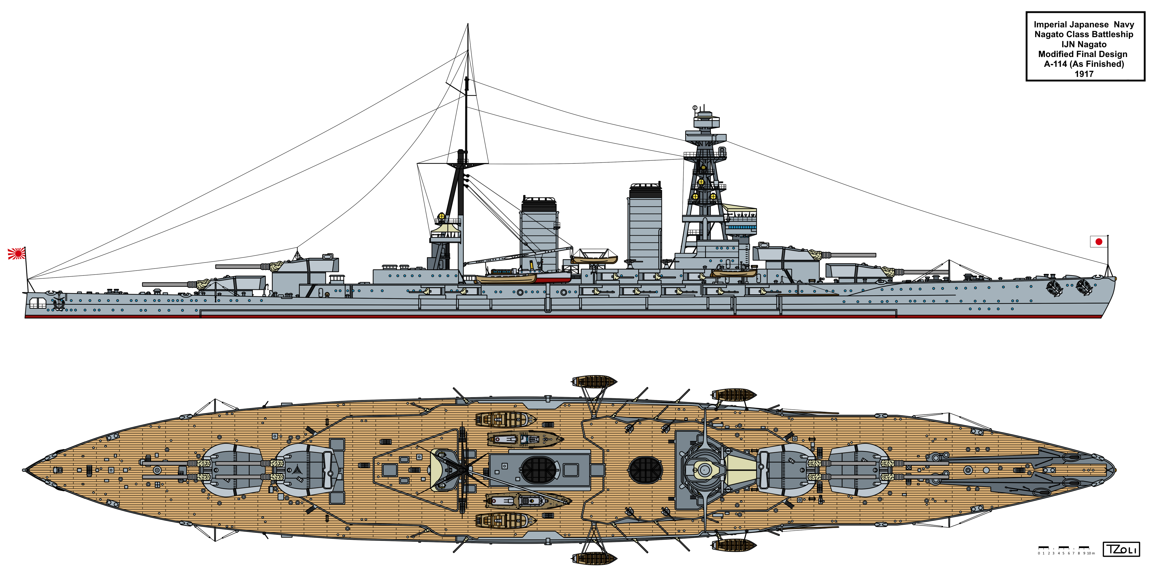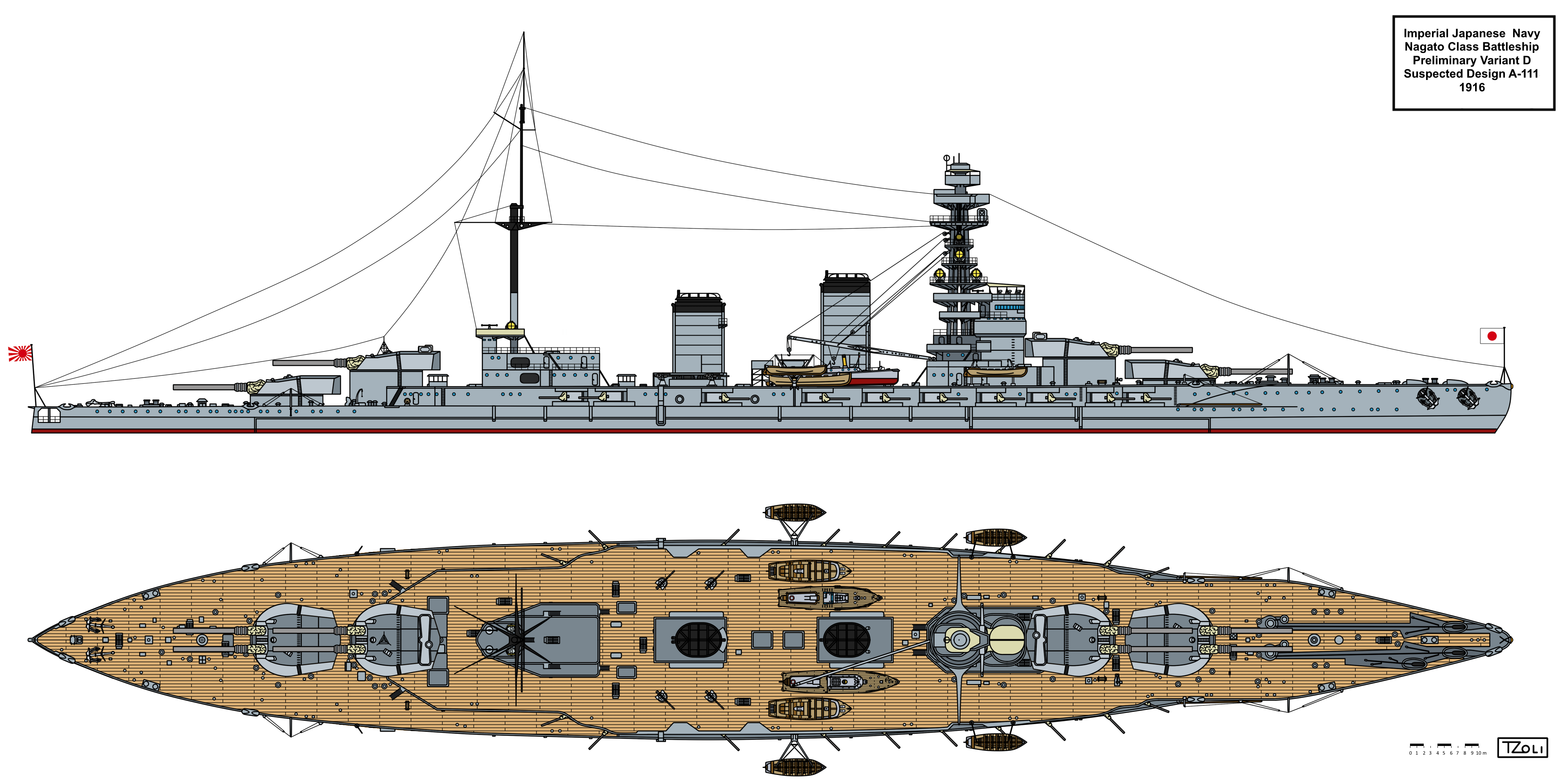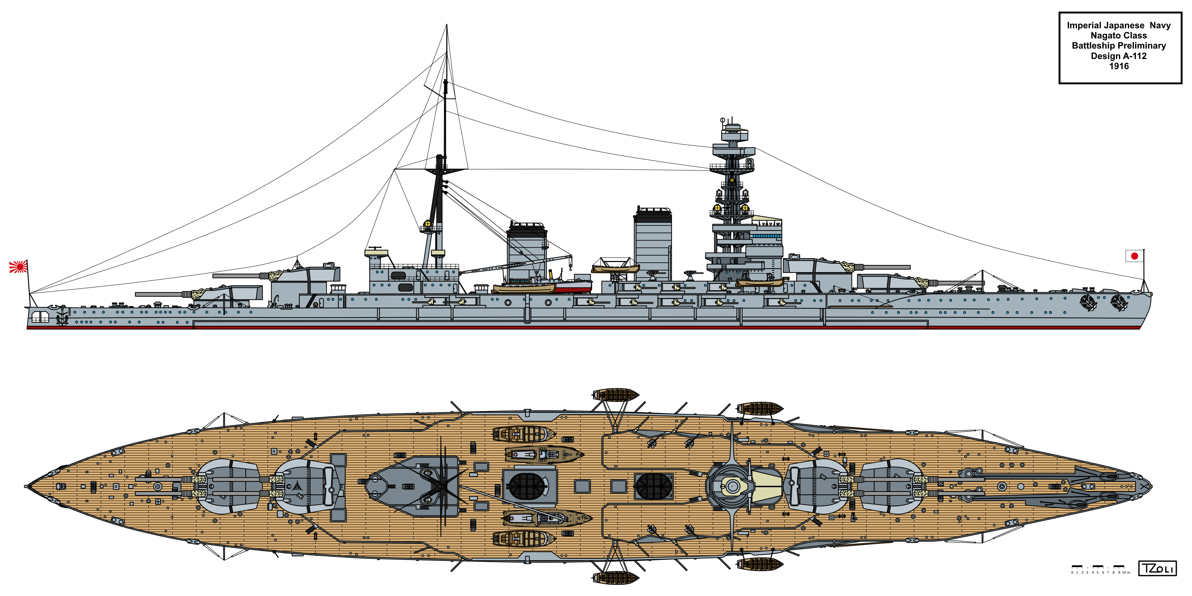 152mm secondary guns and similar arrangement as well, the first deck level and the aft supersturcture reminiscent to that of the Queen Elizabeth Class, hull shape and tripod bridge structure following that of the Ise class and finally of course the armament of 4 twin 41cm turrets that of the Nagato class.