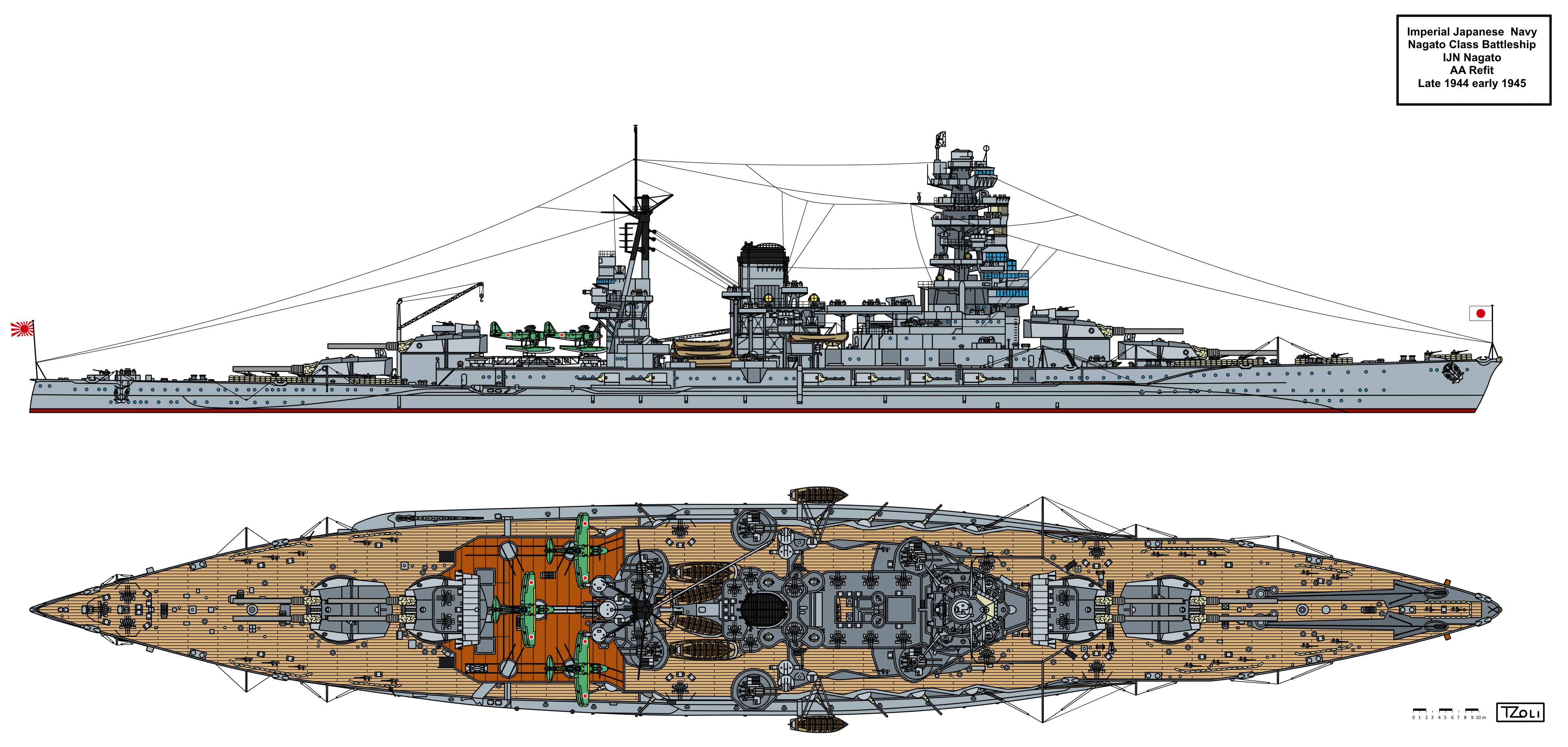 The worsening war situation and the ever increasing aerial threat from the USN and USAAF as well as war experience showed that warships of the IJN were very much deficient in protecting themselves from such threats. As such every warship in the fleet gradually received more and more AA mostly in the form of 25mm machine guns but in some cases 12,7cm DP-AA guns as well to increase their effectiveness in fighting enemy aircraft. This was the case with the Nagato as well, which got her AA refit in mid-late 1944 in the form of one twin 12,7cm Type 89 DP-AA guns on both sides, a large number of 25mm triple and single AA guns around the hull especially on the stern, on the 2nd and 3rd turret tops and on a specially created AA platform connecting the bridge and the funnel increasing their number to 119 barrels. The ship also received radar sets of the usual types: Type 13s on the mainmast aft, Type 21 on top of the pagoda mast and Type 22s on the Main Rangefinder deck. These additions required removal of at least 6 casemated guns partly due to topweight and partly due to battle damage.