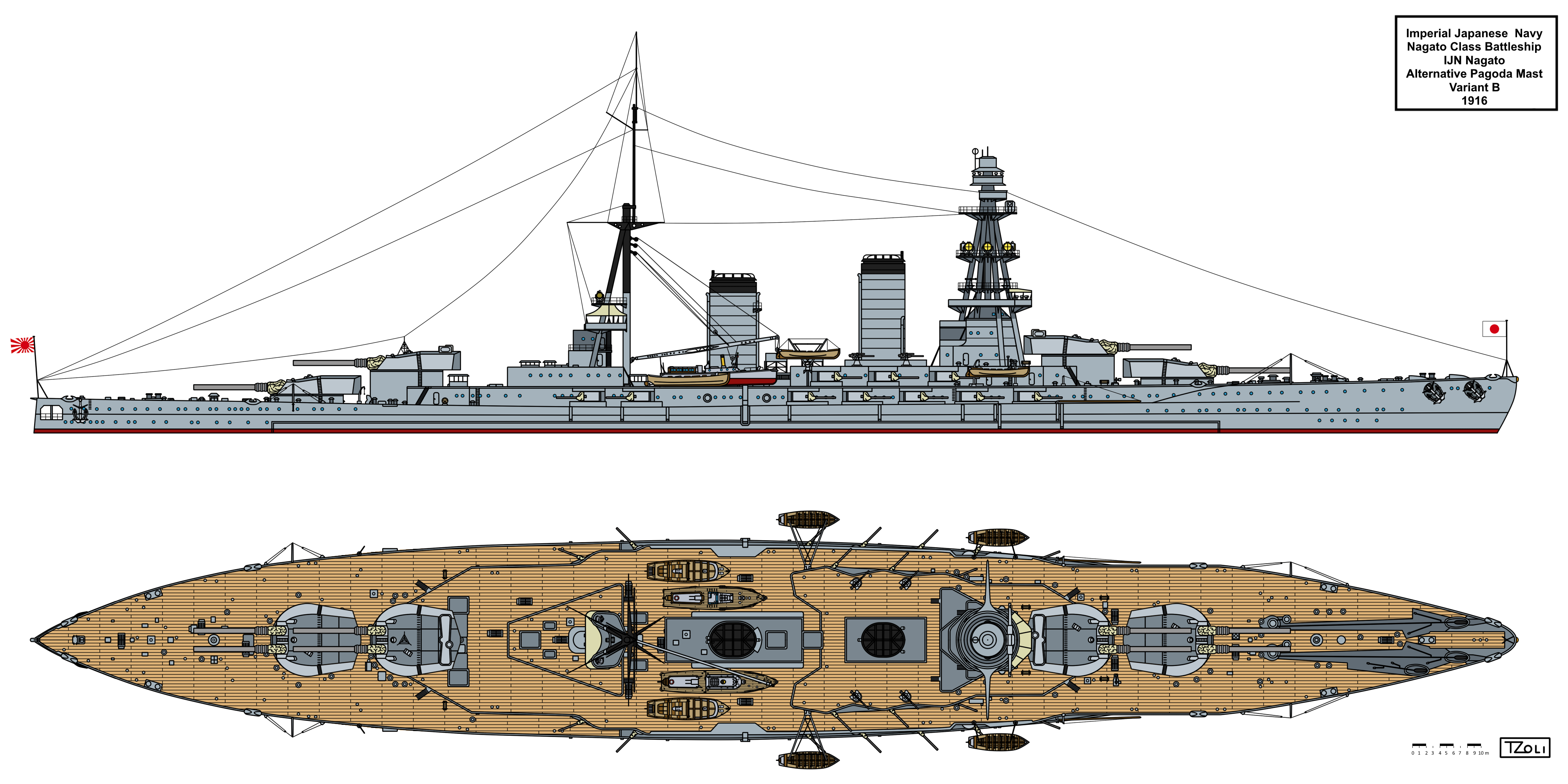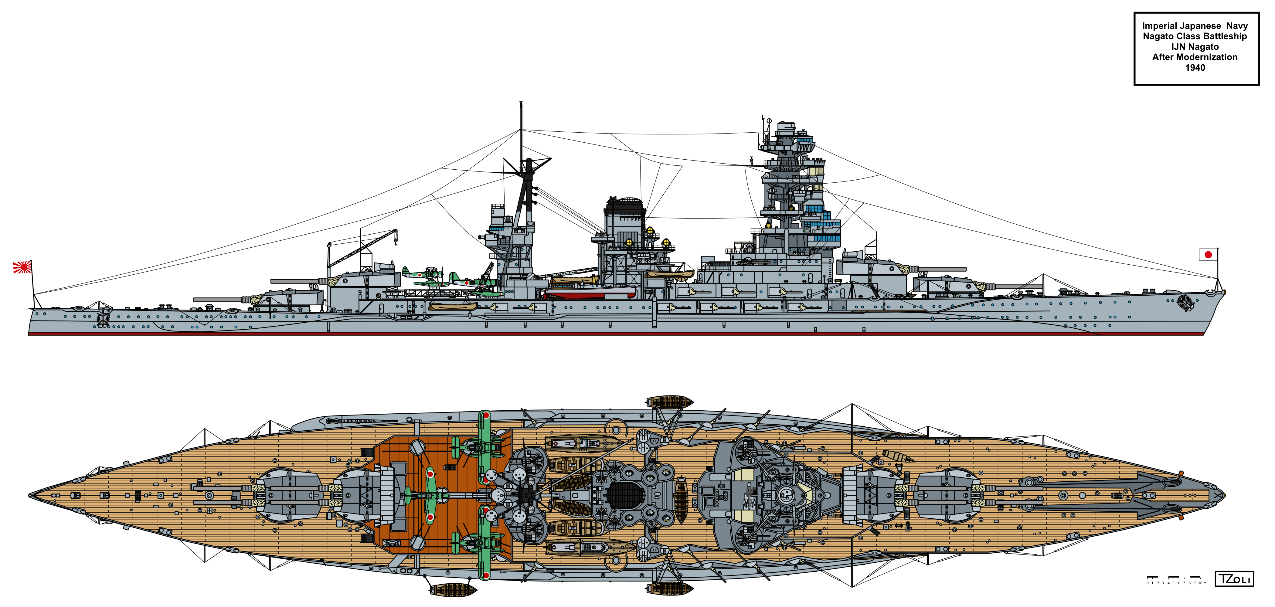 Nagato started her modernisation in August, 1933 at the Kure Naval Arsenal and lasted till January 1936, while Mutsu entered her modernisation phase in September 1934 at the Yokosuka Naval Arsenal and lasted till September 1936. During this time both the stern and nose sections got lengthened with a total of 9,14meters, the Gihon Steam Turbines replaced by Kampon-Parsons produced ones and the 21 Boilers got reduced to just 10 but overall engine power increased from 80.000 to 82.000shp, the funnels too got replaced by a single larger one. Both the forward pagoda superstructure and the aft tripod mainmast heavily reconstructed with many added platforms, the AA armament too got strengthened by 4 twin 12,7cm Type 89 DP-AA guns and 10 twin 25mm Type 96 Machine Guns. In place of the aft trapezoid shaped superstructure deck, aircraft facilities and a folding catapult was installed with a capacity to carry 3 seaplanes. Protection wise too the ships got upgraded with 127mm extra deck plating one deck below the main 70mm one.