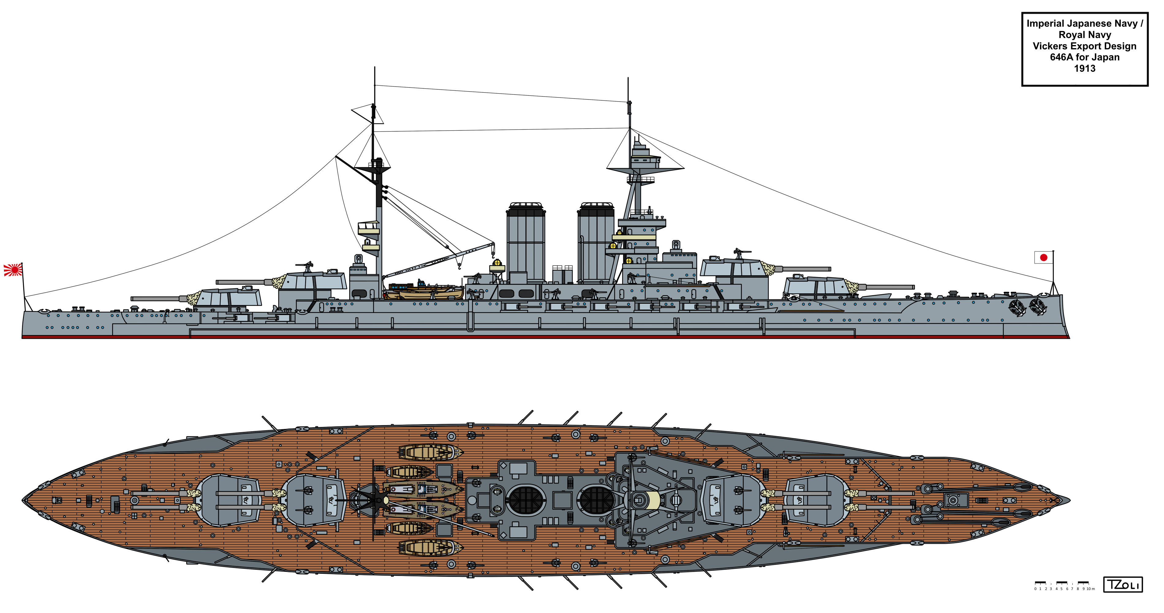 Knowing that Vickers offered designs to the IJN in 1913 the Ise class started construction in 1915 I’ve created this drawing showing elements of both: